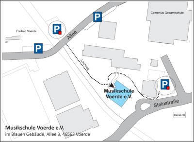 In den Schulferien ist das Büro nicht besetzt. Sie erreichen uns per Email. Da die Musikschule Voerde e.V. über keine eigenen Räumlichkeiten verfügt, findet der Musikschulunterricht seit 01.01.2023 im Blauen Gebäude (Comenius Gesamtschule Voerde) statt. Allee 3, 46562 Voerde